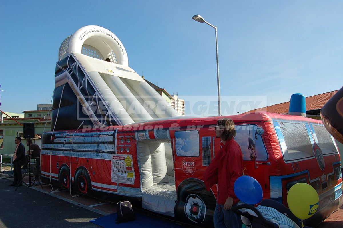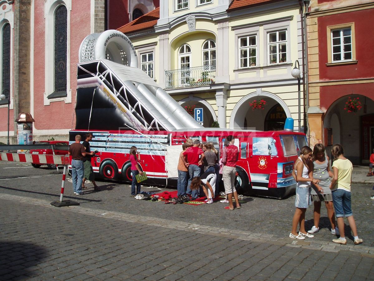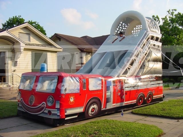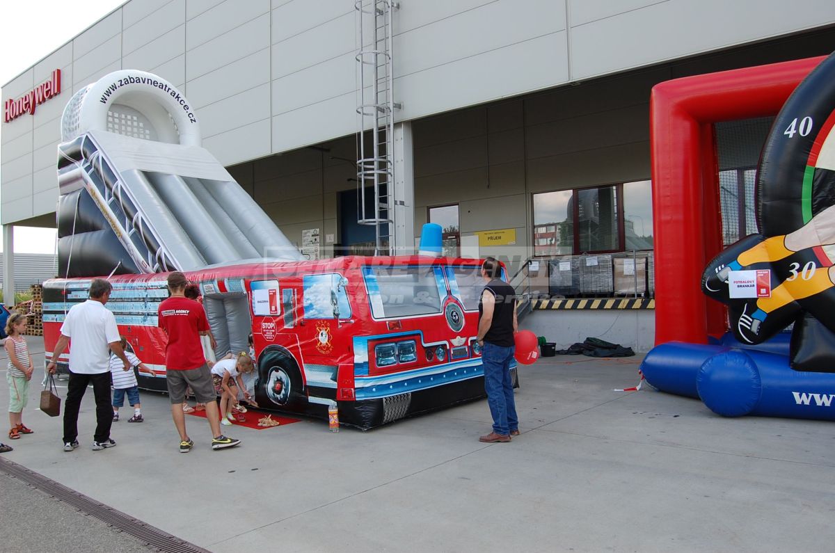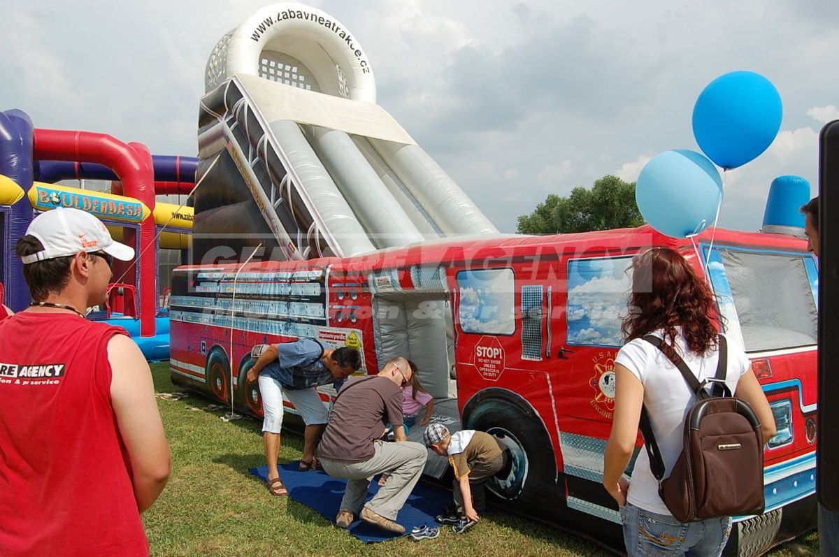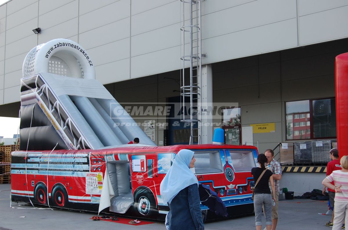 Nafukovacia šmýkačka "Hasičské auto" je obľúbenou detskou atrakciou firemných akcií a detských dní. Do detailu prepracovaná nafukovacia šmykľavka v štýle hasičského auta Vám zaručí dostatok pozornosti. Splňte deťom ich sen byť hasičom s nafukovacou šmýkačkou hasičské auto. Nafukovacia šmýkačka "Hasičské auto" môže byť doplnená o skákací hrad "Hasiči" alebo aktívne centrum "Hasiči".
