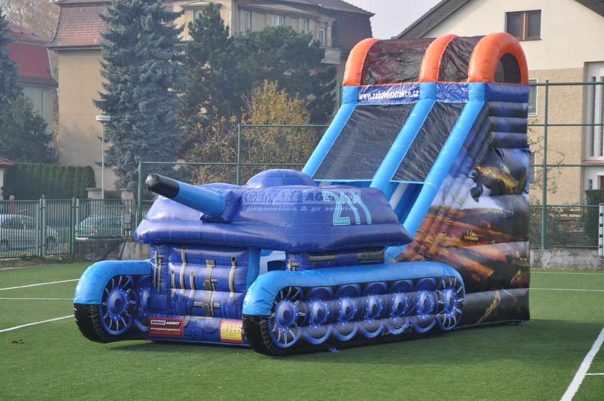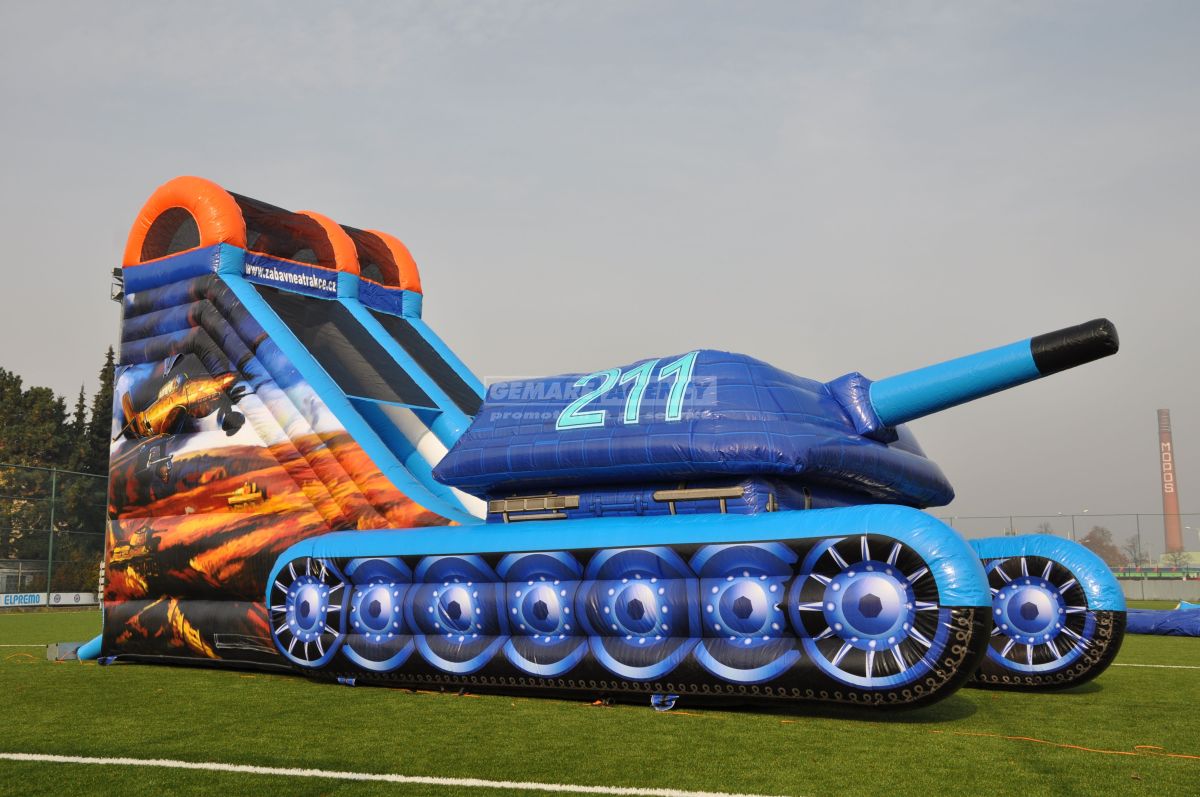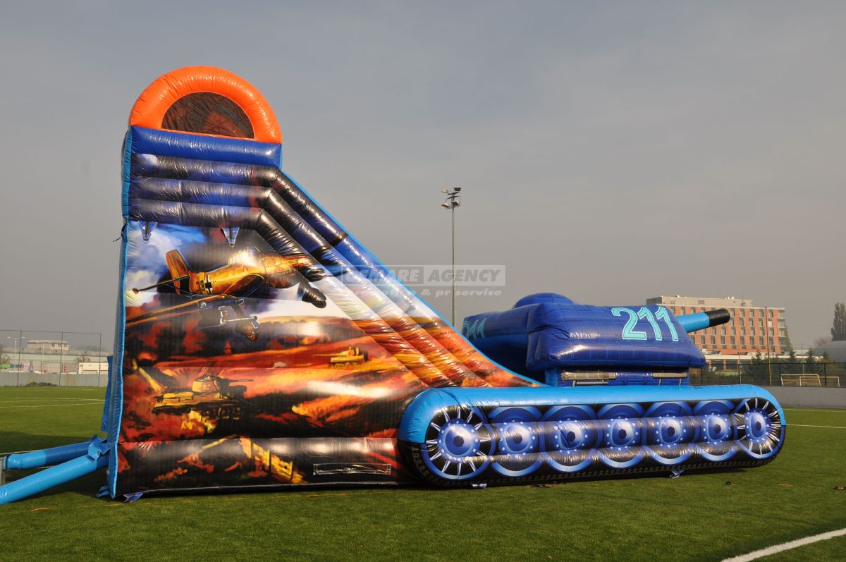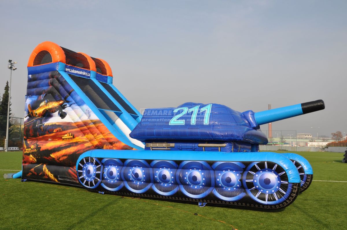 Najobľúbenejšia šmykľavka medzi chlapcami, to je nafukovacia šmykľavka v dizajne tanku. Okrem makety tanku, je atrakcia ozdobená tiež bočnou grafikou s lietadlami. Ideálna atrakcia pre akcie s vojenskou tematikou.