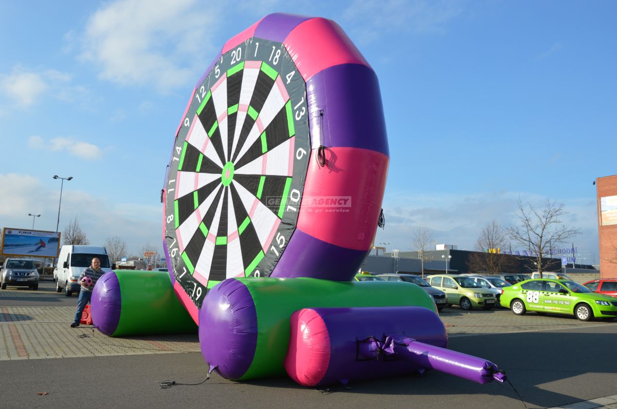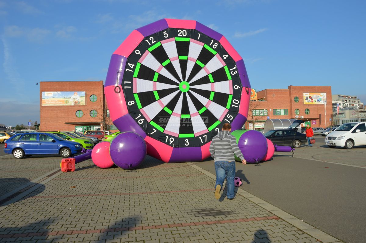 Spojením šípok a futbalu sme dali možnosť vzniknúť novej atrakcii – futbalovým obrím šípkam. Tento veľký nafukovací futbalový terč je ideálnou športovou aktivitou pre detské dni a firemní akcie nielen s futbalovou tematikou.