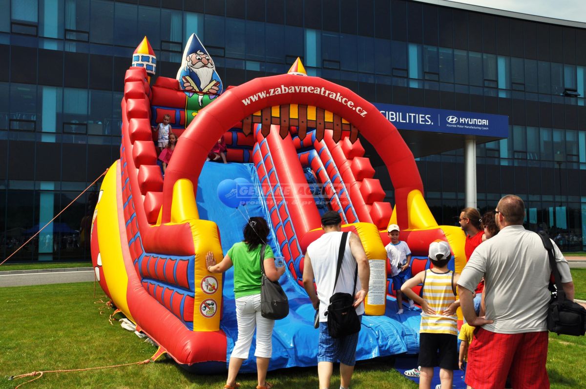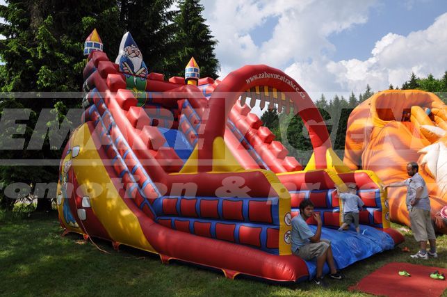 Vydajte sa do čarovného sveta kráľa Artuša s nafukovacou šmýkalkou Merlin! Tajomné hrady, mocní čarodejníci a statoční rytieri ožívajú s našou ďalšou detskou atrakciou. Nafukovacia šmýkačka Merlin je farebná, pestro zdobená a deti ju milujú. Nafukovacia šmýkačka vždy poteší všetky deti.