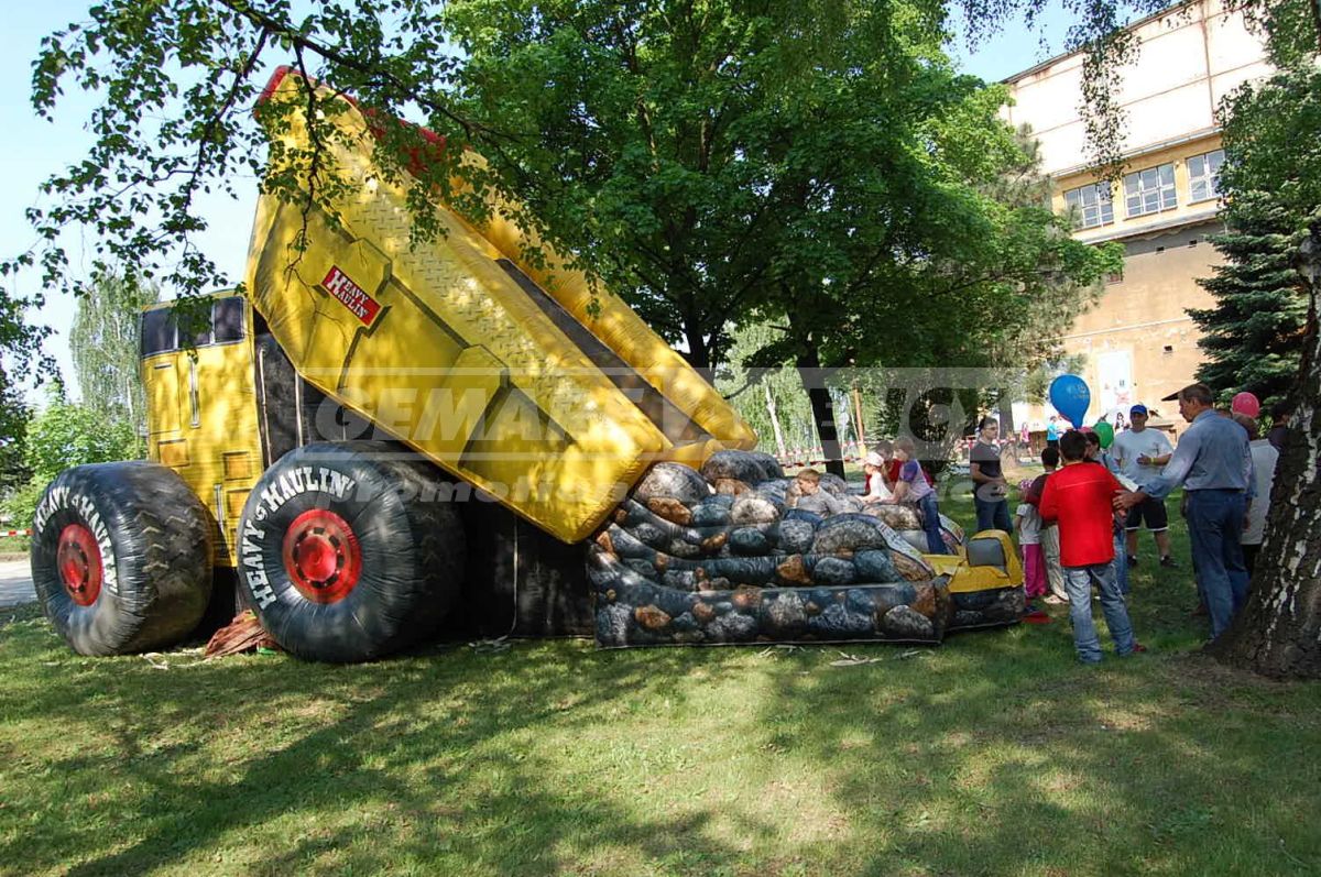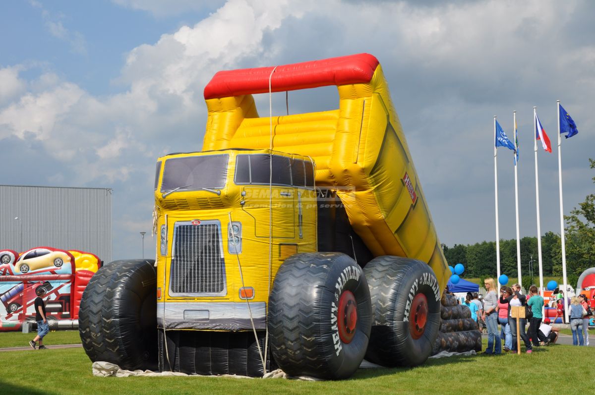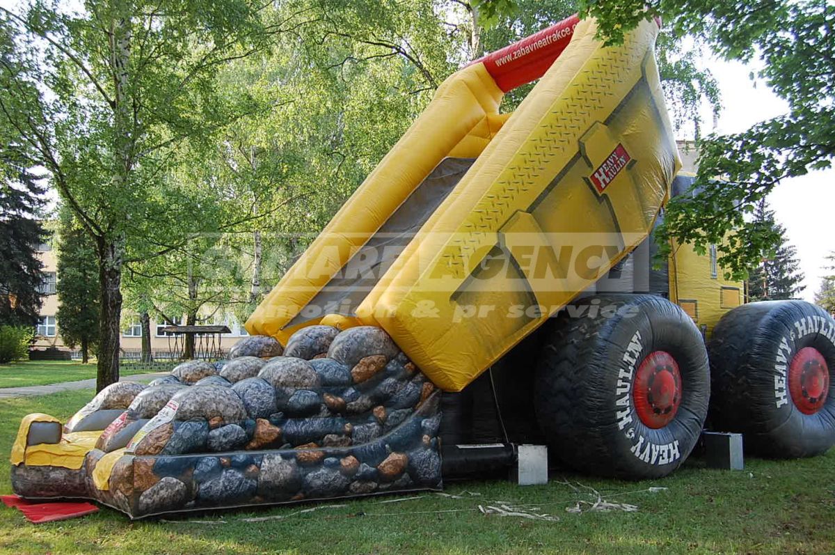 Nafukovacia šmýkačka v tvare obrovského nákladného auta, sypajícího hromadu kamenia, je ďalší z exkluzívnych nafukovacích šmýkačiek. Netradičný dizajn nafukovacie šmykľavky priláka veľa zvedavých pohľadov a návštevníkov. Nafukovacia šmýkačka "Nákladiak" je vhodná pre prezentačné akcie predajcov nákladných vozidiel, autosalóny a veľtrhy.