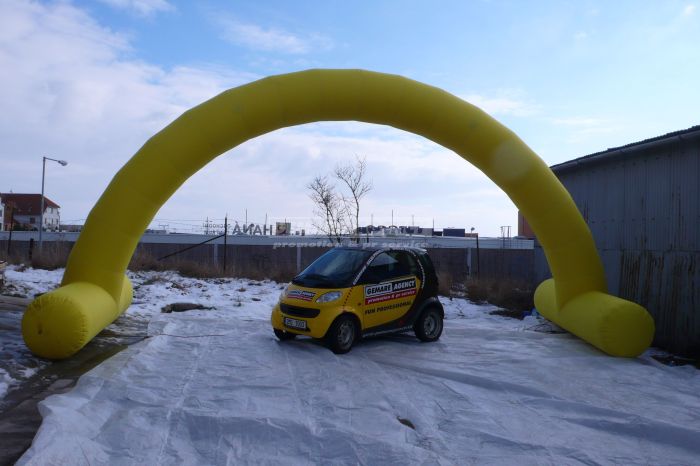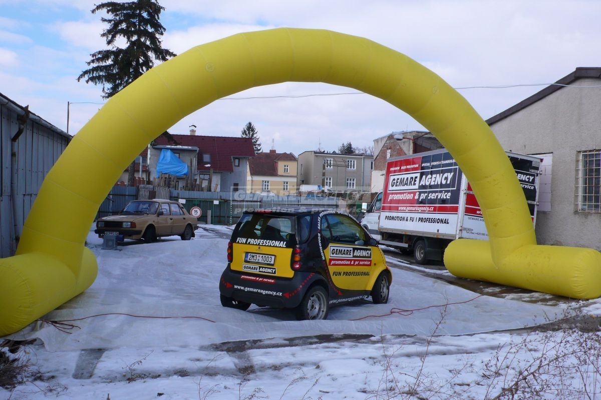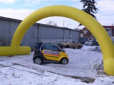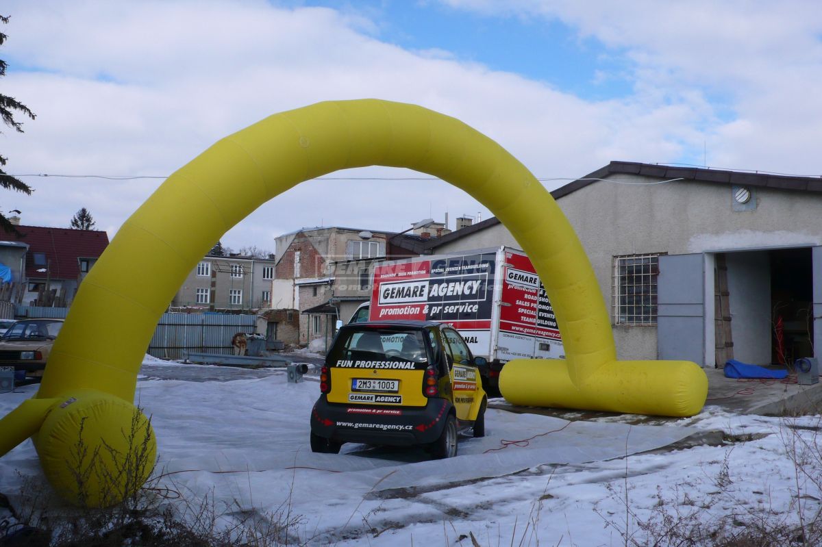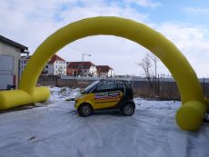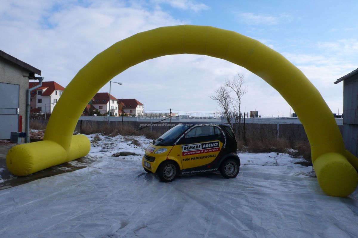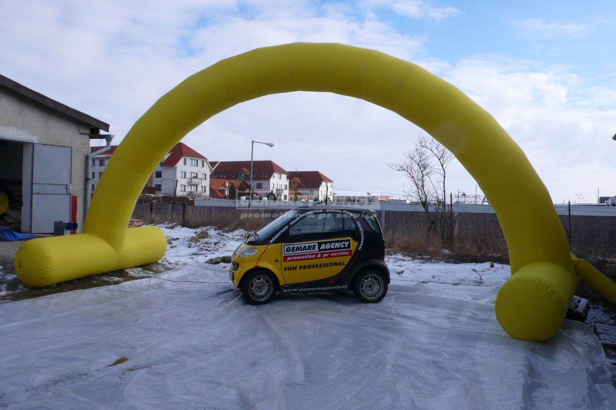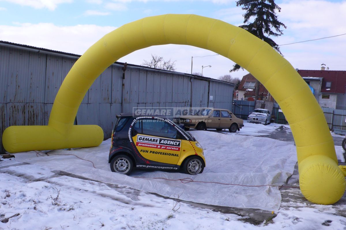 Desať metrov široký a päť metrov vysoký nafukovací oblúk je samozrejme možné opatriť logami či nápismi podľa Vášho priania - uchytenie na samotný oblúk je veľmi jednoduché pomocou suchého zipsu. Zaistite si vlastnú bránu vo firemných farbách a prenajmite si nafukovací oblúk!