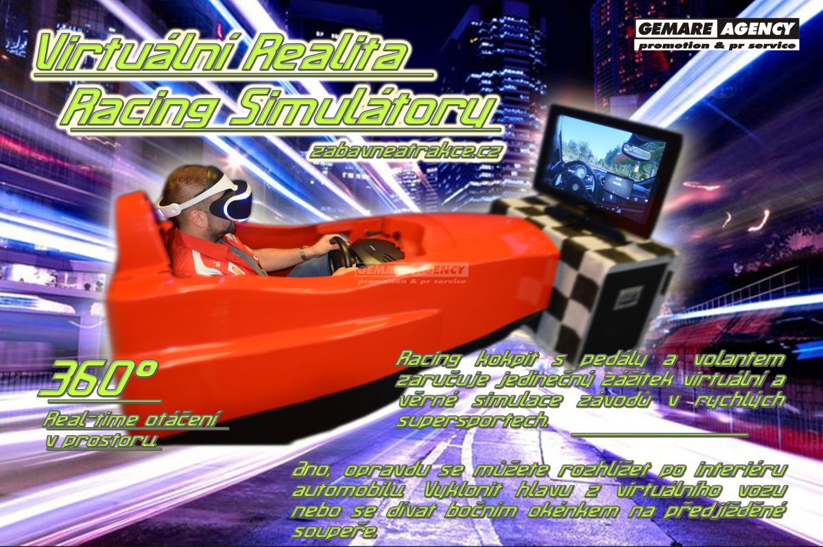Virtuální realita ve spojení s racing simulátorem Vám přinese jedinečné zážitky. Ve věrně zpracované závodní hře, si budete moci prožít řízení těch nejlepších a nejnovějších sportovních aut - celkem 90 vozů, na rozličných tratích, 6ti rozdílných prostředí, jako např. kanadské lesy, norské zasněžené průsmyky, nebo chilská poušť. Virtuální brýle Vám dovolí rozhlížet se v 360° a kochat se jak okolím tratě, tak i perfektně zpracovaným interiérem každého vozu. Chcete se vyklonit z okénka a pořádně se rozhlédnout? I to lze v našem virtuálním závodění dělat. Volant a pedály Vám pak dopřejí pocitu, že opravdu řídíte daný vůz. Jako jediní v ČR nabízíme 3 kusy racing simulátorů s virtuální realitou.