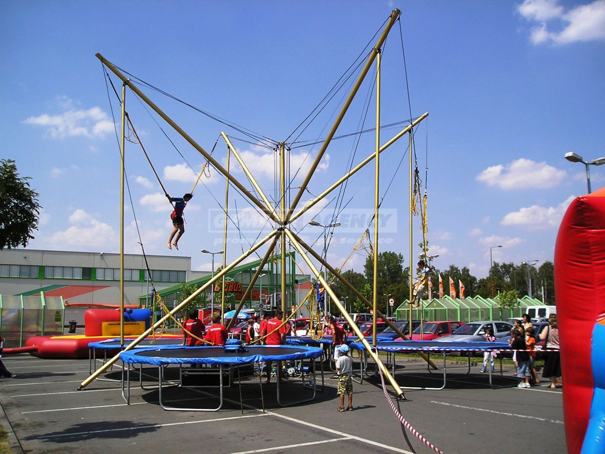 Bungee trampolína, 4in1 trampolína alebo 4v1 trampolína, to všetko sú názvy pre jednu z najobľúbenejších atrakcií. Atrakcie bungee trampolína je určená pre 4 skokanov, ktorí sú priviazaní k bungee lane a vlastným odrážaním od bungee trampolíny sú vystreľované do vzduchu. Naše bungee trampolína je ako jediná najvyššia v SR. Prenajmite si bungee trampolínu na Vašu akciu.